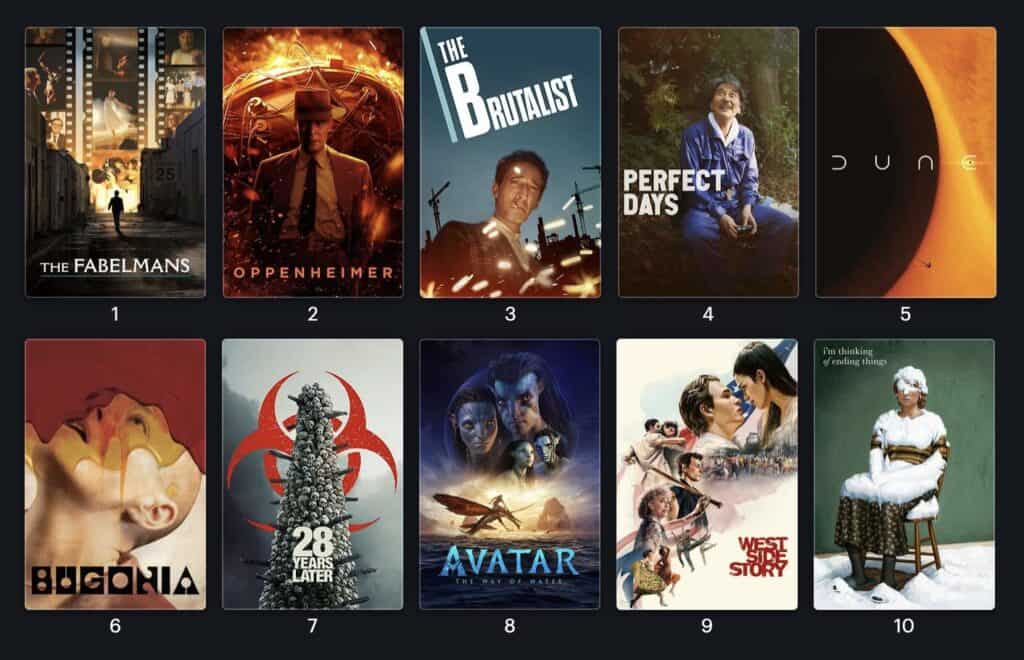 Først, ei topp ti-liste over alle mine favorittar frå 2020-talet. Deretter nokre filmar frå dei siste åra eg har digga heilt generelt.