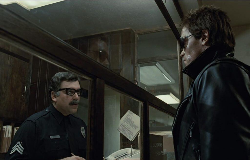 På politistasjonen er Reese i arresten og blir vurdert av ein gjespande psykolog spelt av Earl Boen. Her får vi MEIR eksposisjon, der Reese fortvila prøver å få dei til å forstå at Sarah – og menneskja – er i fare. Reese snur seg mot kameraet oppe i taket og slepper ut all frustrasjon. På Michael Biehn sin podcast fortel han at det var hans idé å kike mot kameraet; slike små, geniale ting som oppstår undervegs.