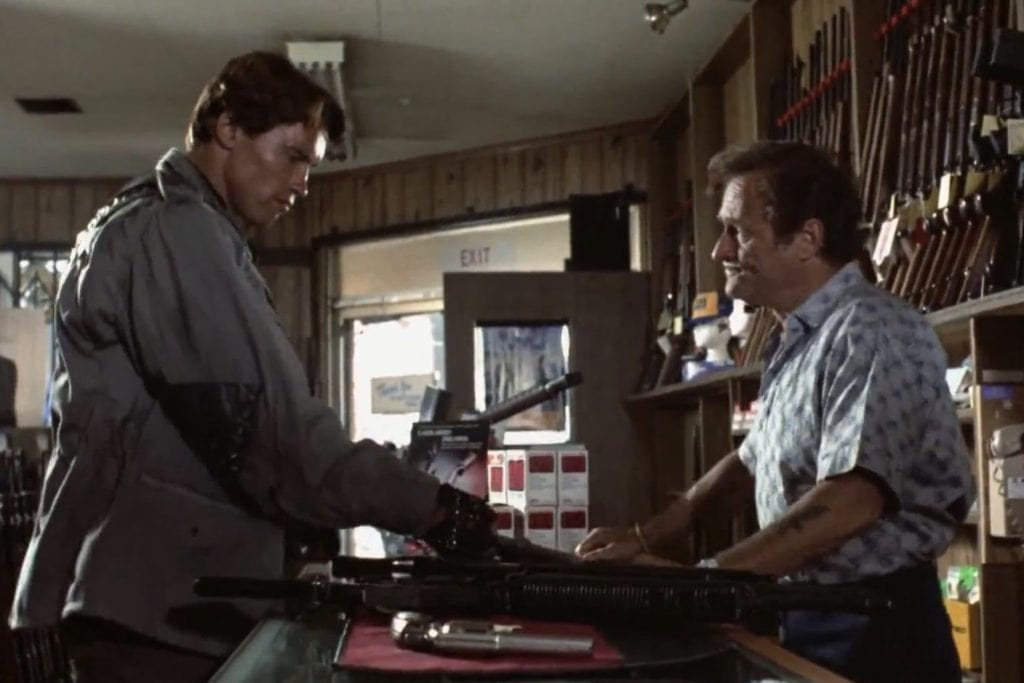 Før det får vi sjå Arnold handla våpen hos legenden Dick Miller (RÅ SCENE!). Vi får sjå Reese, som er «streetsmart», skaffe seg våpen og unnslippe politiet som ein katt inne på eit kjøpesenter. På kort tid har han sko, frakk, pistol og pumpehagle (RÅTT RÅTT RÅTT!).
